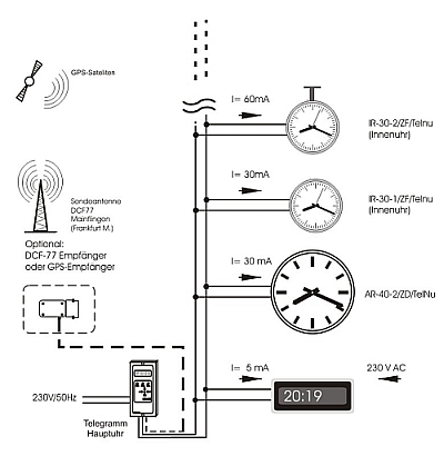 | Das drahtlose Uhrensystem synchronisiert ein Uhrennetz in einem oder mehreren Gebäuden. Hierbei sendet die Hauptuhr die Zeitinformation über 869 MHz. |